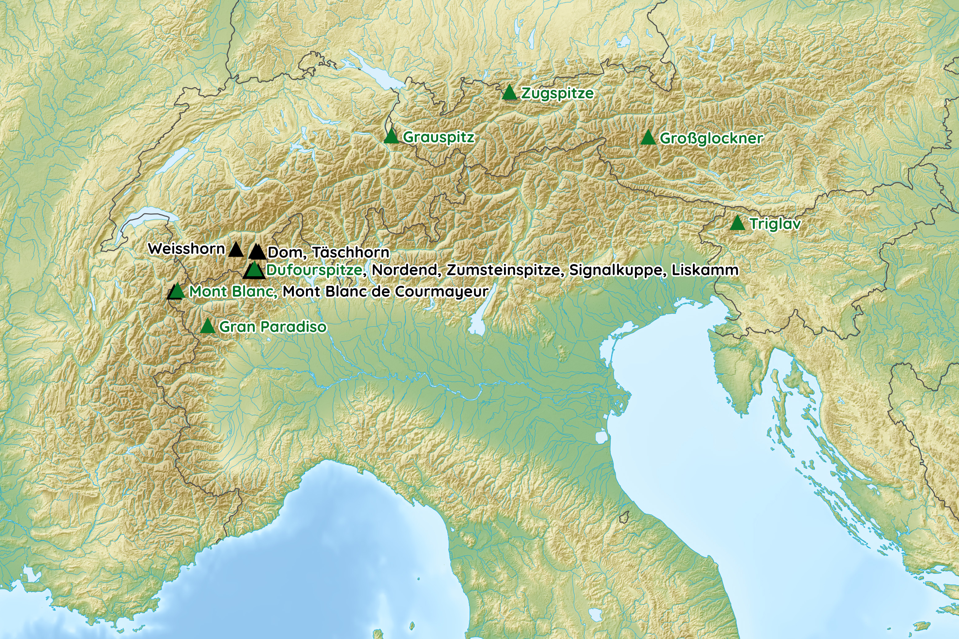 Zum Start habe ich eine Landkarte mit allen Gipfeln für euch: Die Seven Summits habe ich grün, die Top 10 schwarz eingezeichnet. Mont Blanc und Dufourspitze sind in beiden Listen vertreten. In meiner Karte habe ich sie grün markiert.