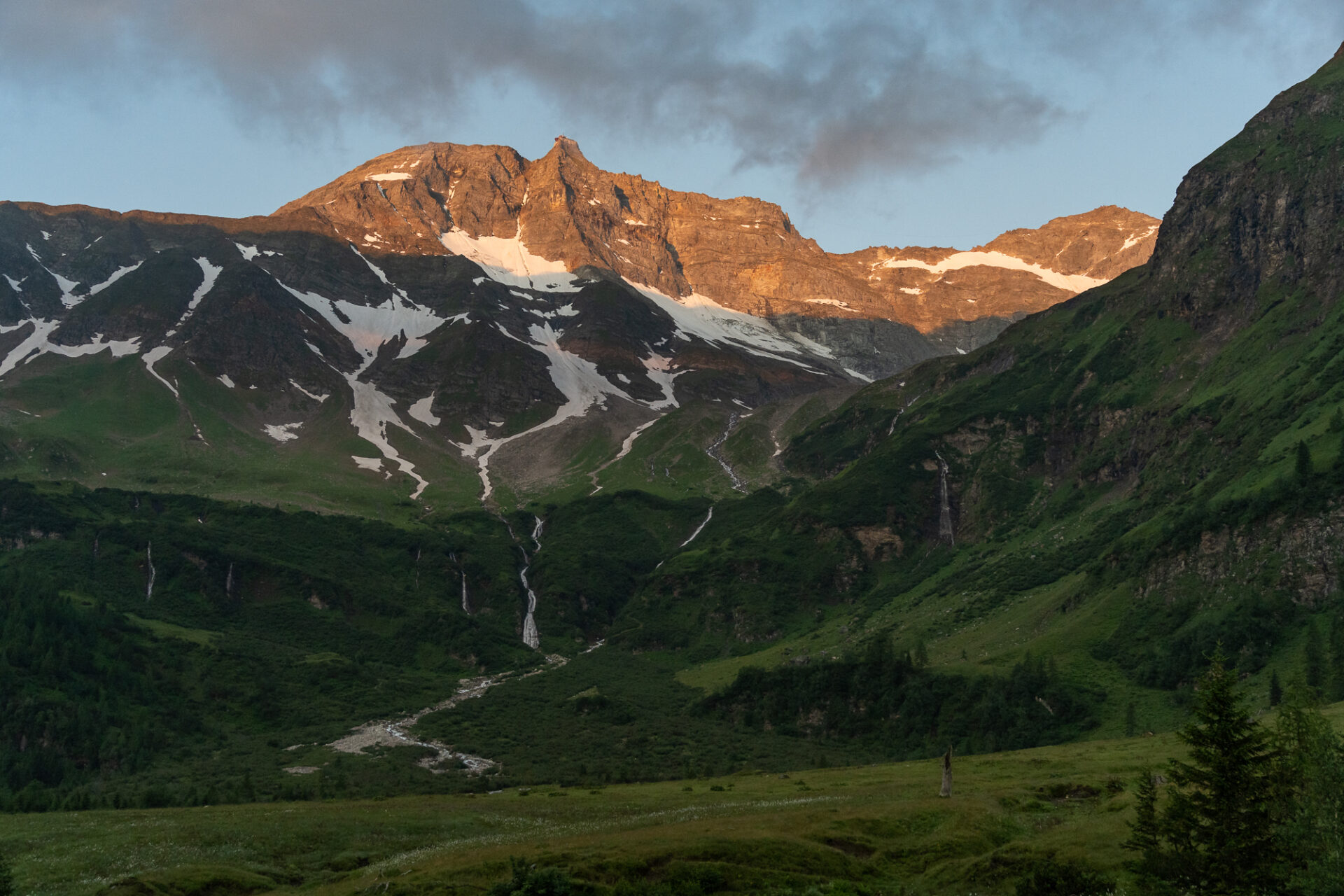 Hinter dem Naturfreundehaus beginnt der eigentliche Anstieg. Vorbei am Barbarafall führt ein schöner, schnell an Steilheit gewinnender Steig durch den Hochwald. Auf knapp 1.900 Metern lässt man die Baumgrenze letztendlich hinter sich und kann mit dem Schutzhaus Neubau (2.176 m) bald das nächste Zwischenziel erkennen. Mit jedem Schritt wird der Blick zurück ins Rauriser Tal schöner und so vergehen die Höhenmeter zur Hütte wie im Flug.