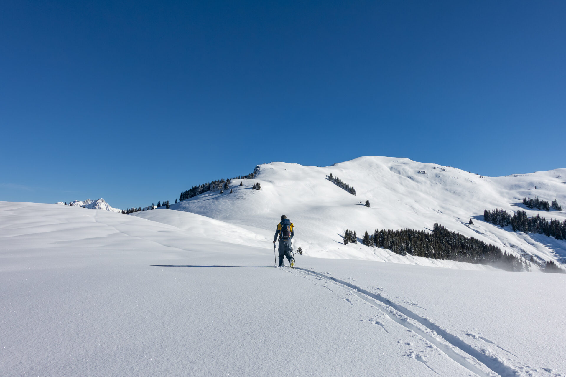 Die Abfahrt folgt im Wesentlichen dem Aufstiegsweg. Einziger Wermutstropfen: Am Rücken wartet ein rund 500 Meter langes Flachstück (ca. 1.820 m) mit kleinen Gegenanstiegen – hier heißt es noch einmal auffellen. Danach wird’s aber wieder genussvoll, vor allem, wenn man die Schwalbenwand so unverspurt erwischt wie wir.