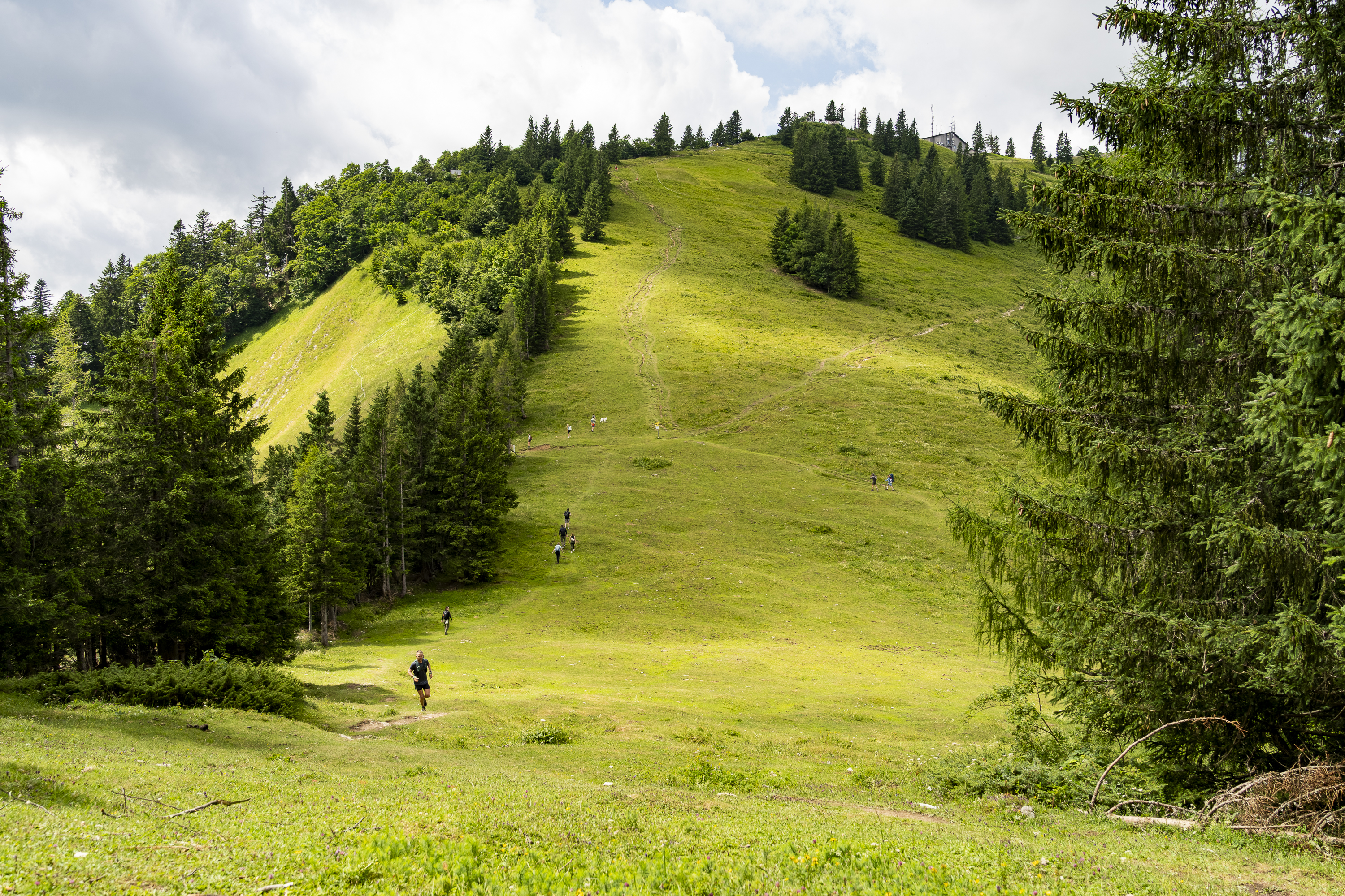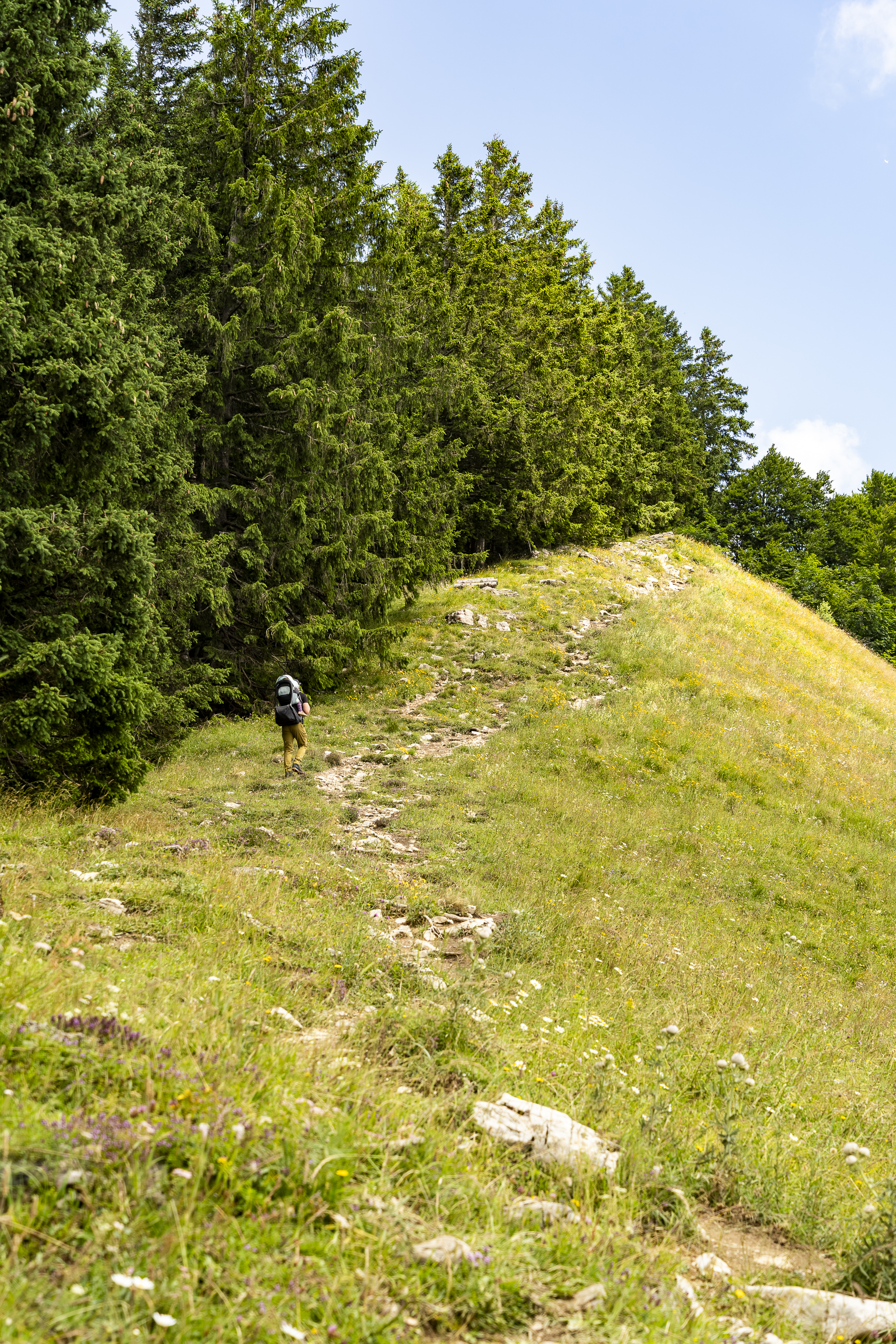 Über einen herrlichen aber steilen Rücken geht es bergauf. Immer wieder öffnen sich herrliche Ausblicke Richtung Schafberg und Wolfgangsee. Mit einer Kraxe am Rücken wäre der Weg stellenweise vermutlich schon sehr steil. Es gäbe auch eine andere Variante unterhalb der Bahn. Diese ist aber weniger aussichtsreich und mit Sicherheit nicht so lohnend.
