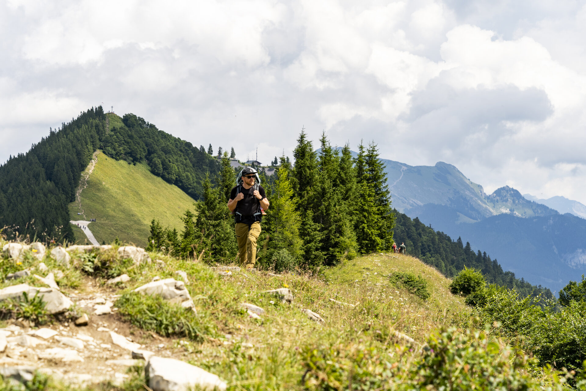 Der Rundwanderweg startet direkt bei der Bergstation der Zwölferhorn-Seilbahn und führt einmal rund um das Plateau. Der Weg ist breit und damit für jeden geeignet. Lässt man die beiden Gipfelkreuze aus, an denen man vorbeikommt, ist die Wanderung auch mit dem Kinderwagen befahrbar. Wir würden dennoch die Kraxe empfehlen. Eine der schönsten Passagen ist der Weg zum Gipfelkreuz des Zwölferhorns – und das erreicht man eben nur zu Fuß.