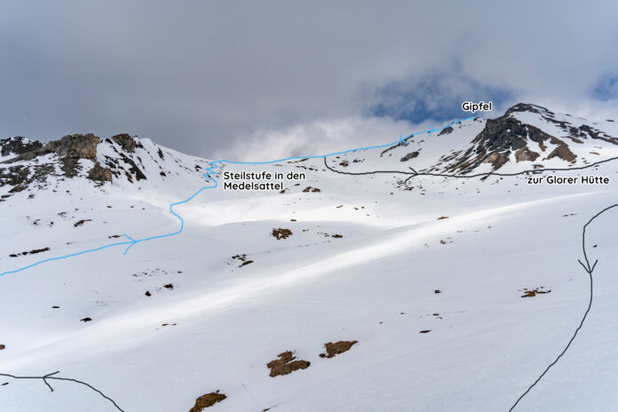 Dafür geht es zunächst über eine Steilstufe hinauf Richtung Medelsattel (2.676 m), anschließend folgt man dem Grat weiter in Richtung Gipfel. Die Tour verändert noch einmal ihren Charakter: Es wird auf einmal spürbar alpiner.