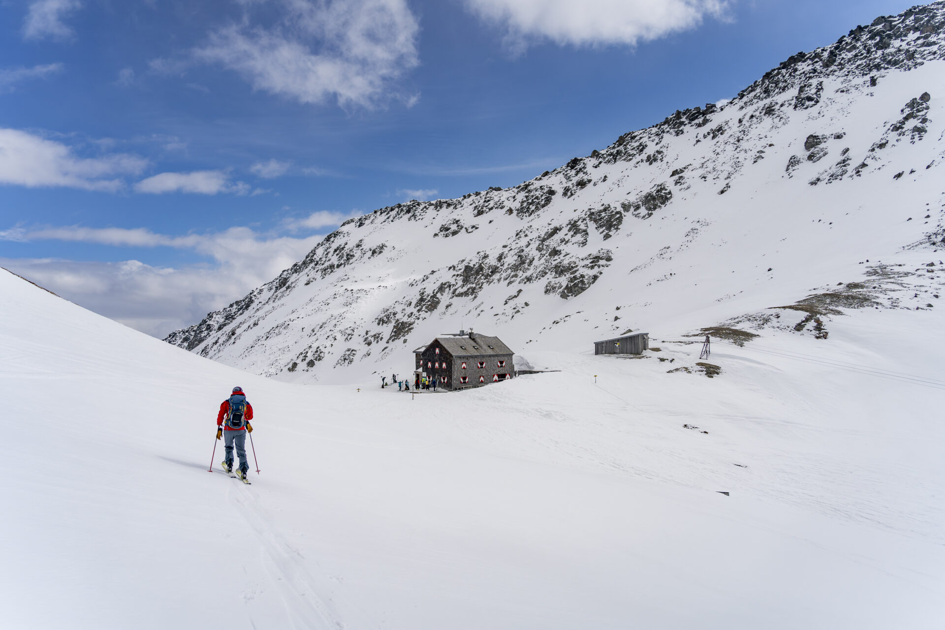 Wer noch Kraft und Zeit hat, kann – wie wir – noch einen Abstecher zur Glorer Hütte machen. Dafür geht es vom Gipfel wieder über den Grat zurück zum Skidepot. Von dort haben wir versucht, möglichst hoch bleibend zur Glorer Hütte (2.642 m) zu queren. Bei sicheren Verhältnissen und guter Linienwahl, braucht es nur einen kurzen Gegenanstieg ins Berger Törl, in dem die Hütte liegt.